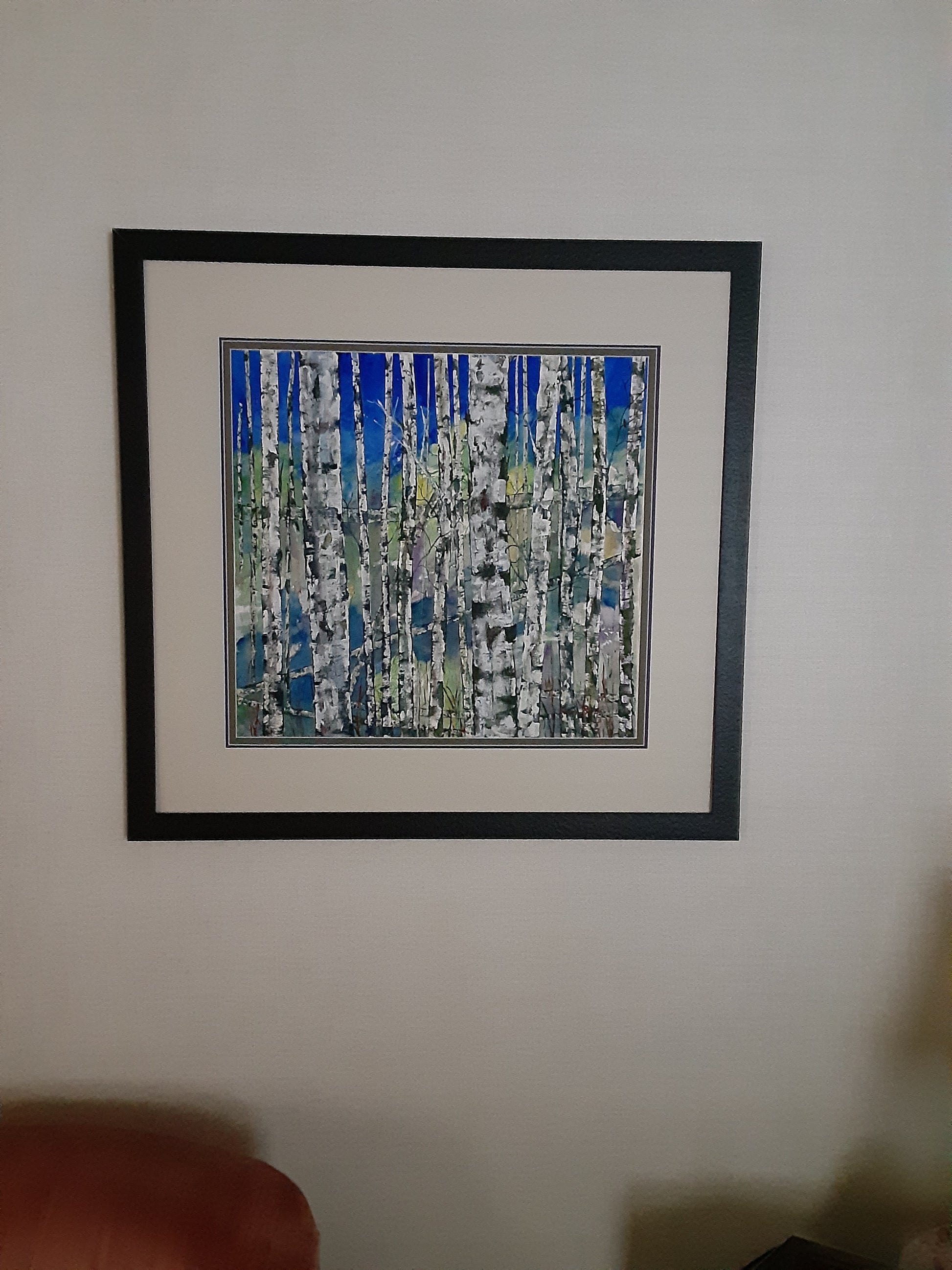"All Alone" is framed in a 1 1/4" metal Elements frame in textured black and has a purple under mat and an olive top mat. This Birch Tree painting is ready to hang. Framed size is 34" w x 32 1/2" h the Image size 22w x 21h