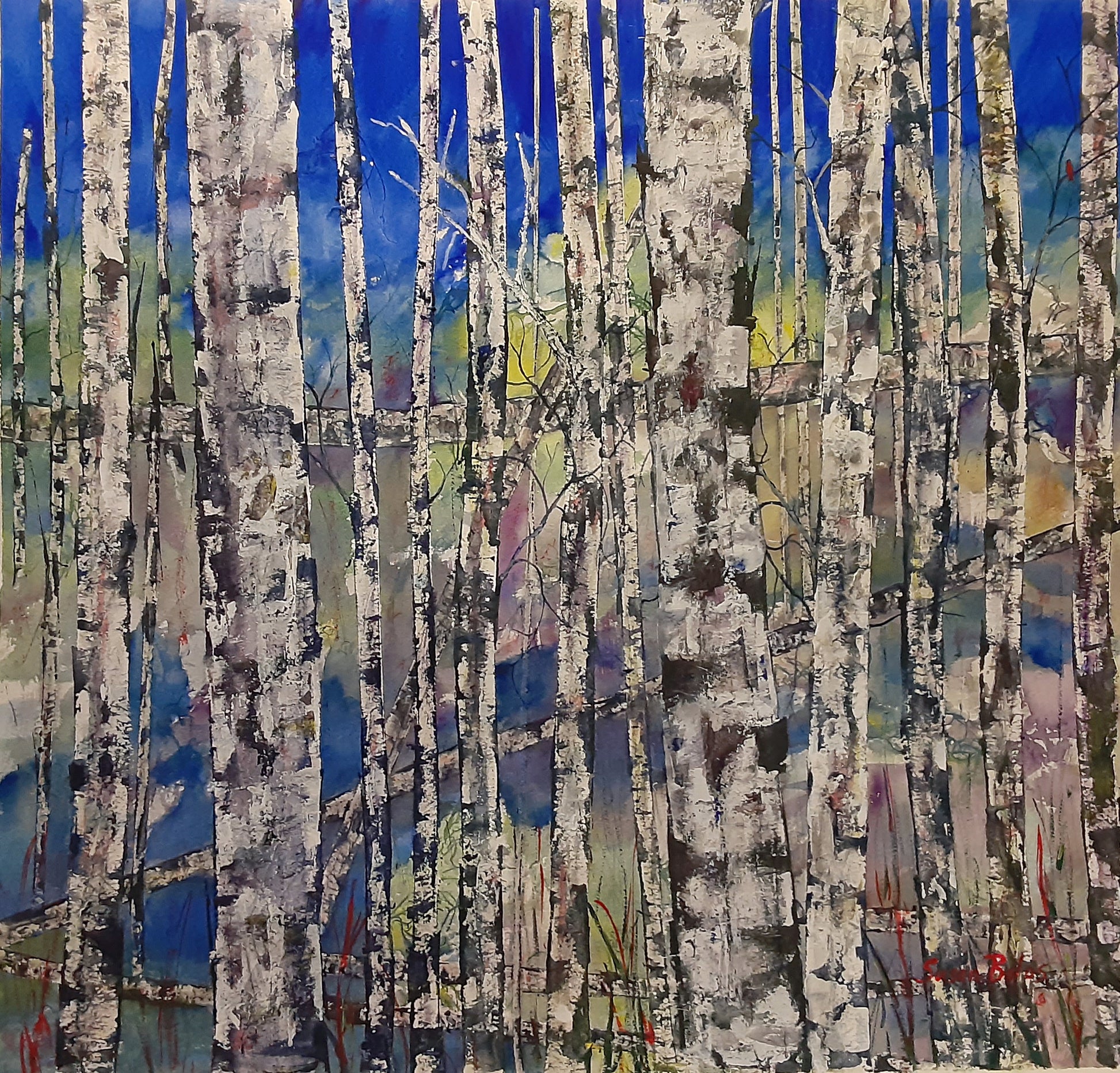 "All Alone" is a ONE OF A KIND abstract transparent watercolor painting of Birch trees on Arches 140# cold press paper.