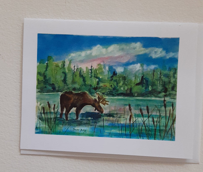 "Alone at the Lake" is a box of 8 note cards and envelopes whose image is from an original watercolor painting of a moose standing in a lake having his lunch.