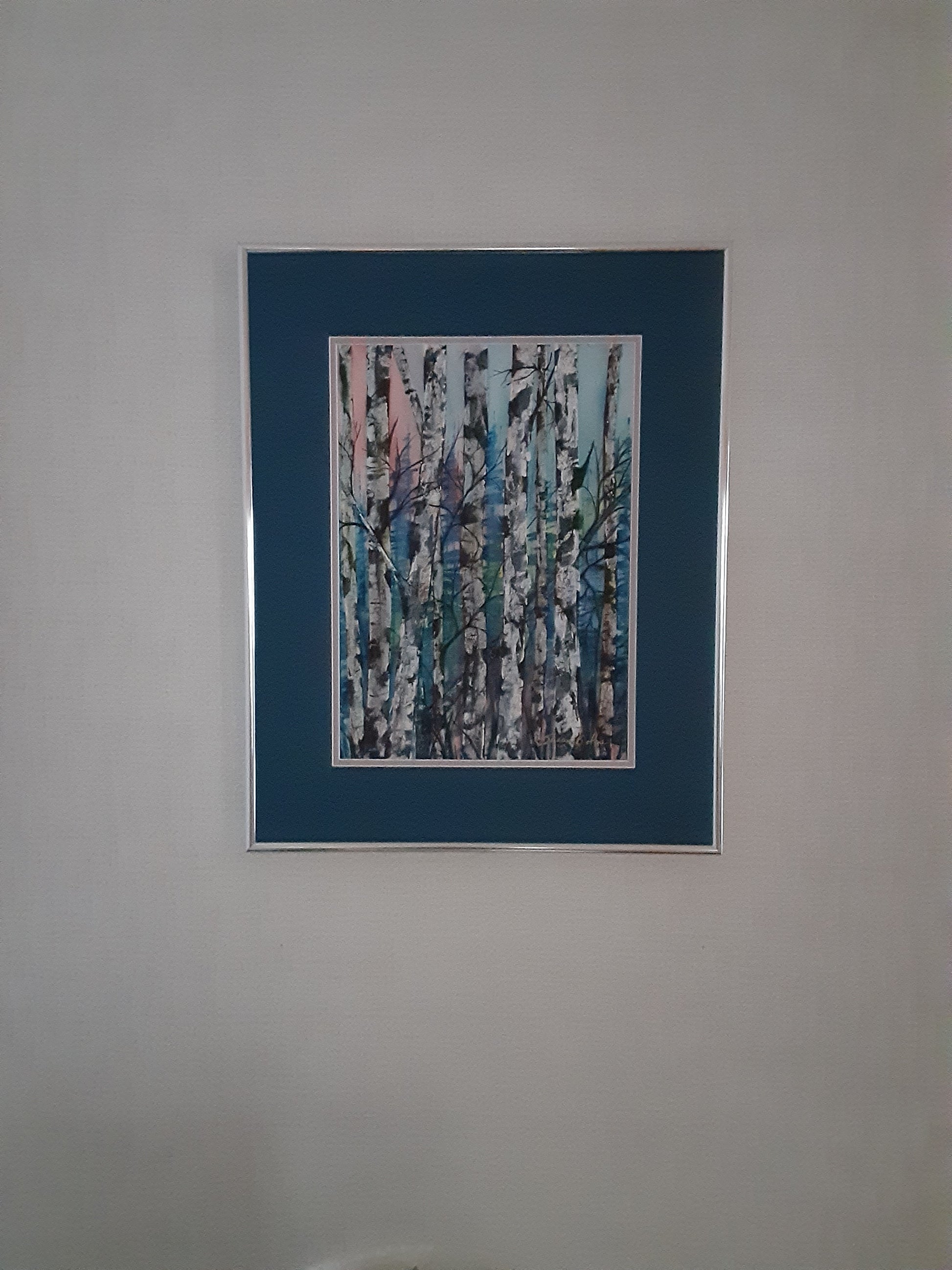 "Birch Trees" is a framed ONE OF A KIND original watercolor painting showing Birch Trees in the foreground with pink in the left sky and a blue background.