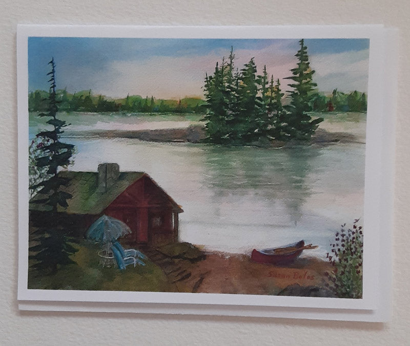 "Cabin Life" is a box of 8 Note Cards & envelopes whose image is from an original watercolor painting. Symbolizing the relaxed summer life on a Minnesota lake.