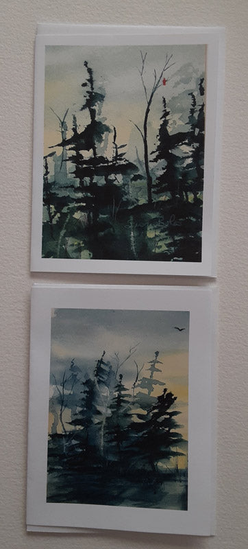 "Red Bird and Grey Day" is a box of note cards whose images were created from original watercolor paintings has 8 cards and envelopes 4 of each image giving you the choice of 2 different cards to send.