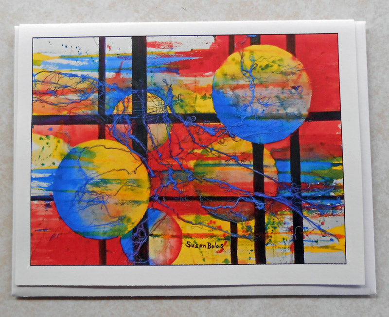 "Where in the Universe" is a box of 8 note cards & envelopes created from an original abstract watercolor painting, This brightly colored card will brighten anyone's day!