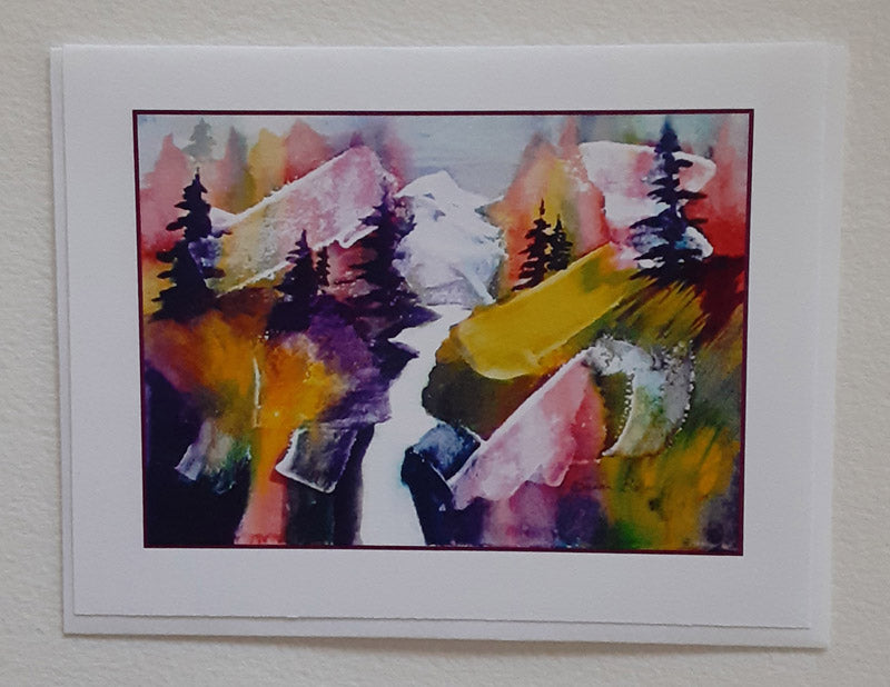 "Dream Scape "is a box of 8 Note cards and envelopes whose bright fun image is from an original abstract watercolor painting. It's sure to brighten up a dreary day.