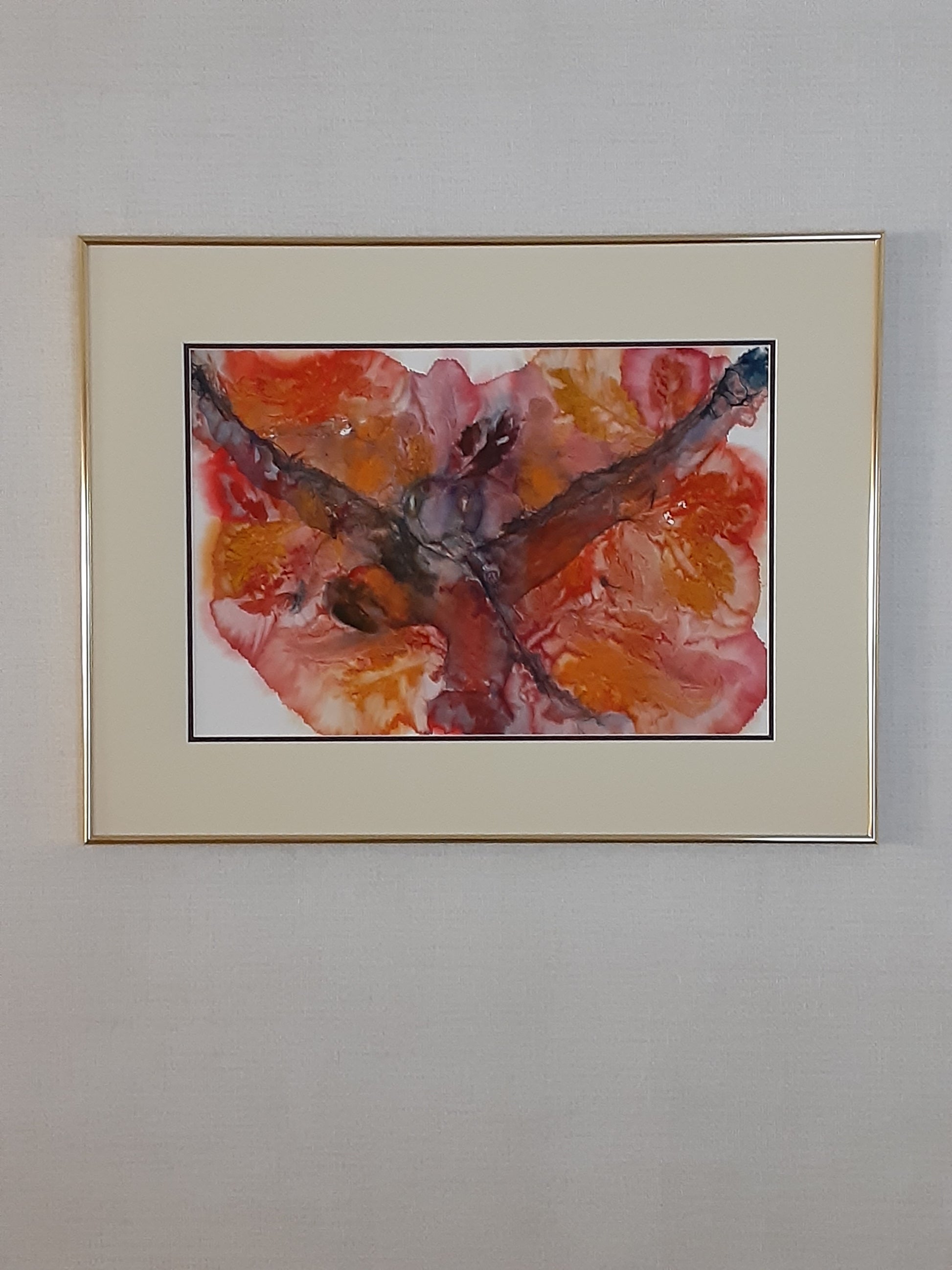 "Here I Go" is a ONE OF A KIND framed Original transparent watercolor multi media on Arches 140# cold press watercolor paper. Escaping the forest fires was the inspiration for this painting. "Here I Go", painted with vibrant colors was an award winner at the Artists of Minnesota Show. Framed is 22 3/4 h x 30 w , this painting is ready to hang in your office or home. Painting has a Rounded shiny gold frame with glass has an off white mat.
