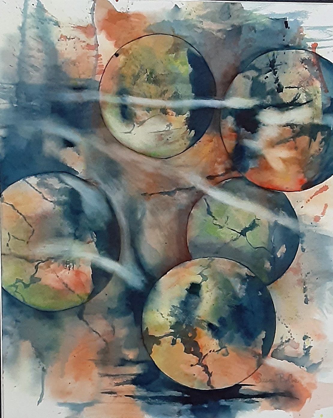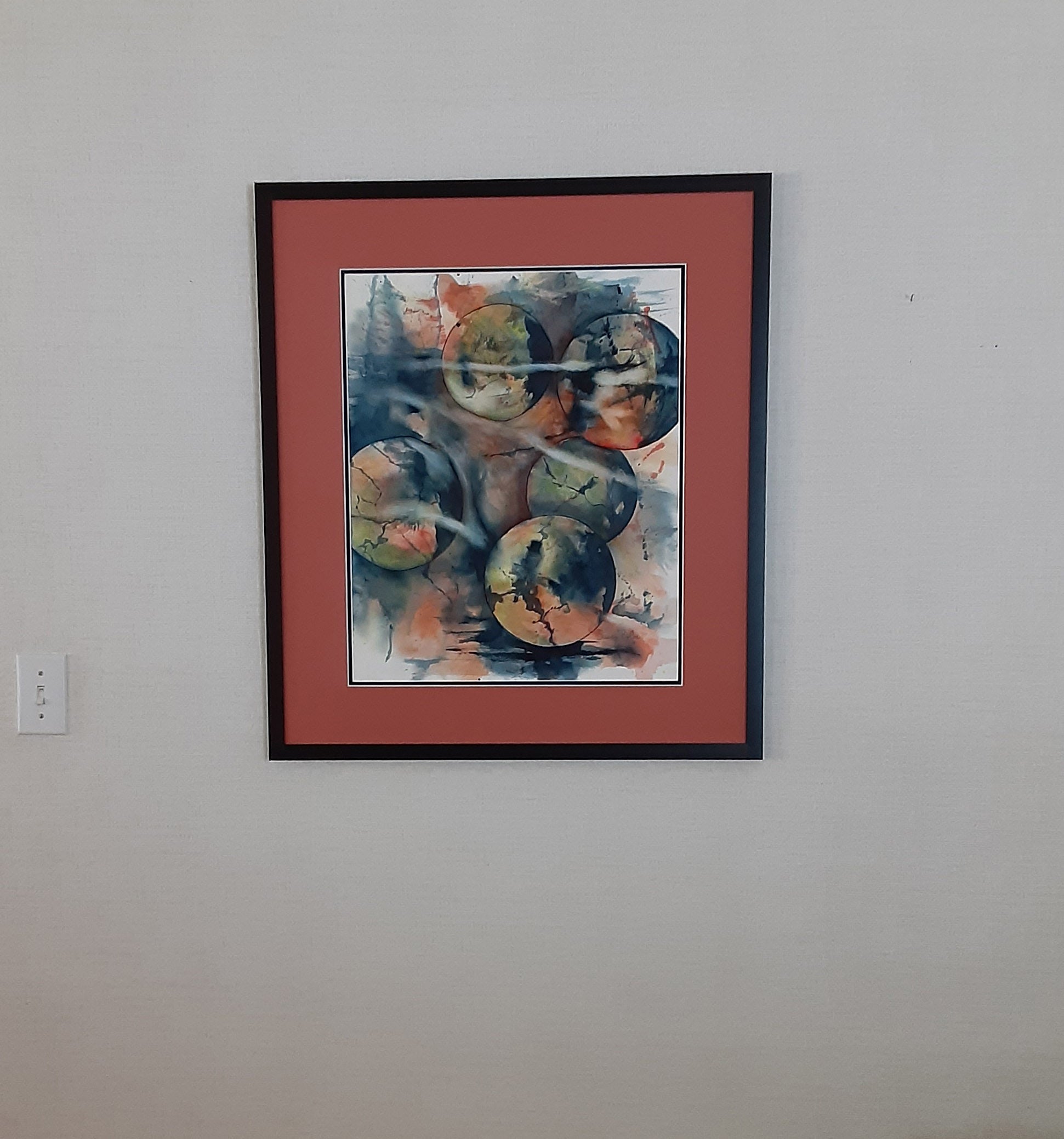 "In a Hurry" is a ONE OF A KIND abstract original transparent watercolor painted on Arches 140# cold press paper. "In a Hurry" is a planetary painting using black, orange, green, and white showing the planets hurrying along in space. Framed this painting is 27 w x 31 h Is ready to hang in your office or home. This painting has a Nielson 1" matte black metal frame and acrylic instead of glass to protect the painting from UV.