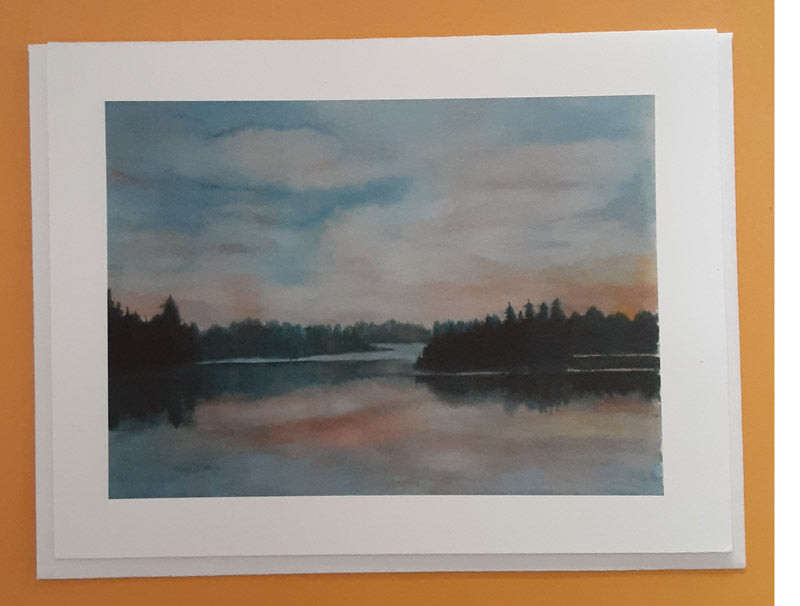 "Little Boy Lake" is a box of 8 note cards and envelopes whose image is from an, early morning, original watercolor painting of Little Boy Lake near Walker, MN.
