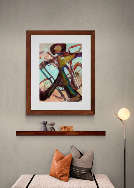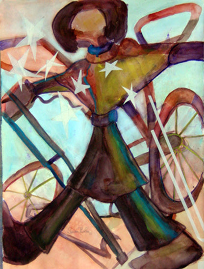 "My Way To Heaven" shows a figure holding a crutch while walking away from a broken bicycle. ONE OF A KIND unframed abstract original transparent watercolor painted on 140# Arches cold press paper.