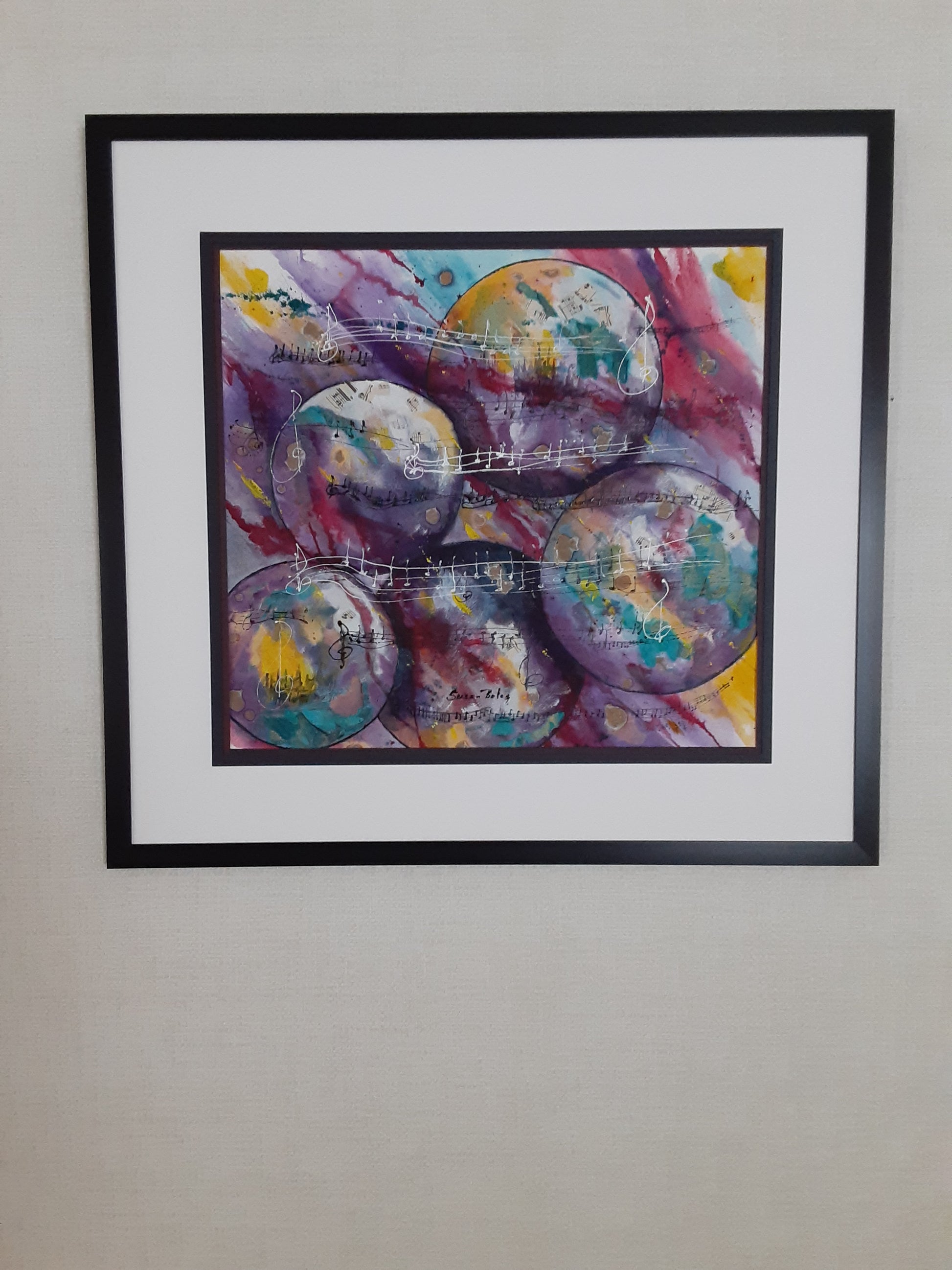"Out There 2" is a ONE OF A KIND multimedia watercolor original painting on 140# cold press paper. The Red, purple, yellow, and teal colors I used in this abstract painting are vibrant.. This ready to hang painting would make a statement on any office wall. Image size 20 1/2 w x 18 h Framed at 28 w x 27 1/2 h frame is Nielson metal 1" w flat black Top mat is white, next is black , bottom is wine. I use acrylic instead of glass to protect my painting from UV and it makes the painting lighter to hang and carry.