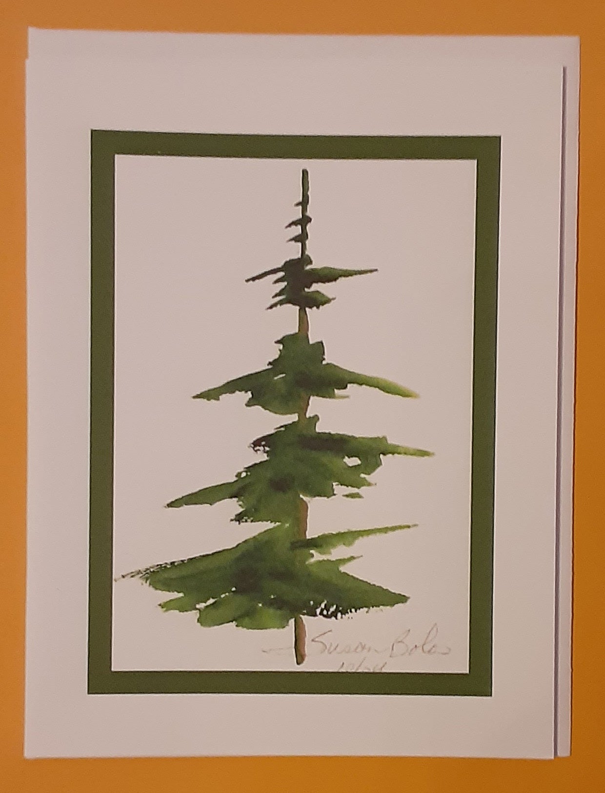 "Slender Pine Tree" is a box of 8 note cards and envelopes whose image was created by an original watercolor painting. This note card is versatile in its use for any season any reason as determined by what you have to say. Get a box to have on hand.