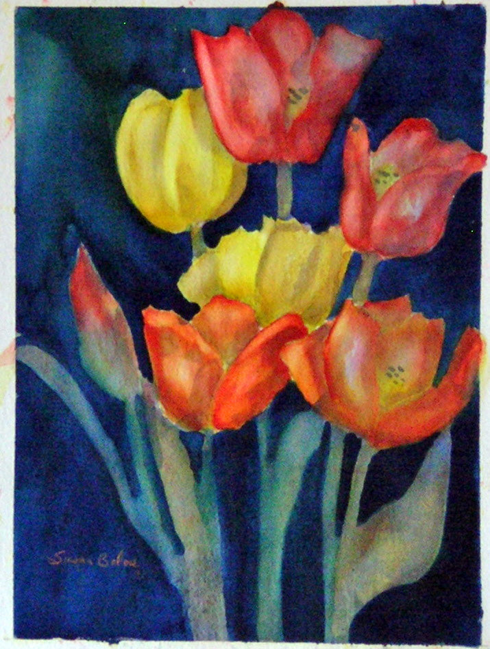 "Tulips" is an original transparent watercolor painting on 140# Arches paper. Tulips are orange and yellow in color. Image size 7 1/2w x 10 1/2h Prints and note cards are available.