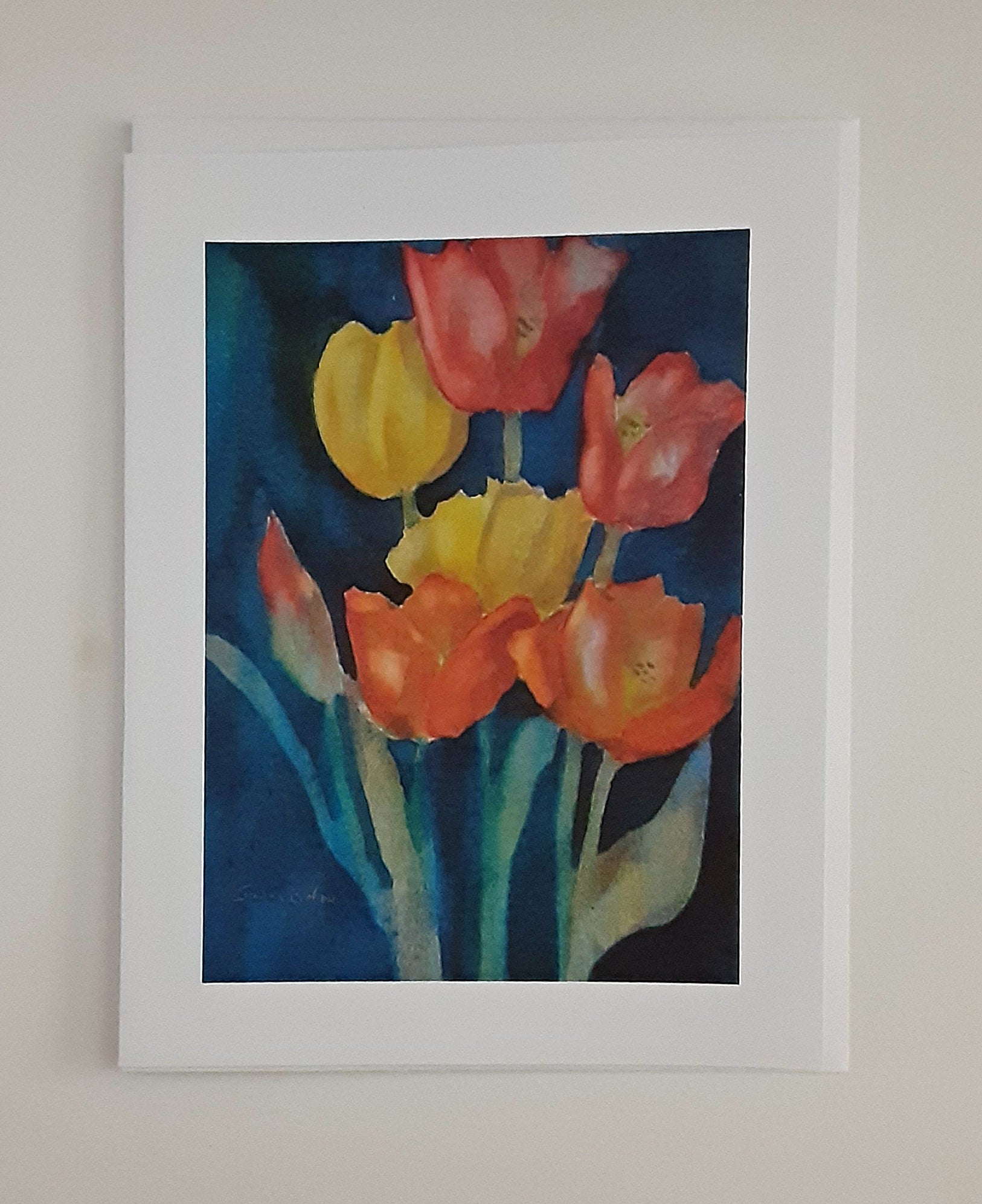 "Tulips" is a box of 8 note cards and envelopes whose image was created from an original watercolor painting.
