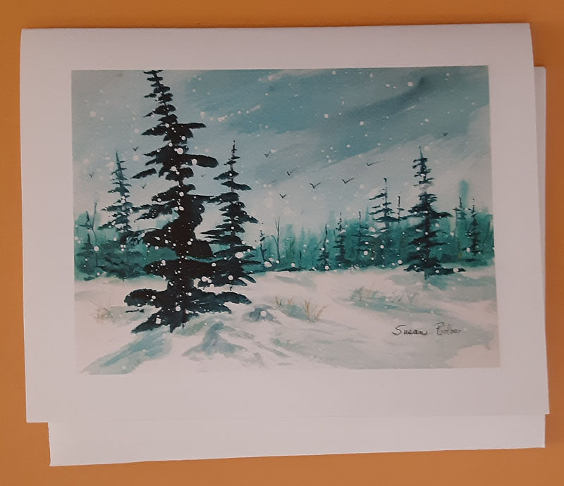 "Winter" is a box of 8 Note Cards and Envelopes whose image was created from an original watercolor painting. Represents the winters on northern Minnesota.