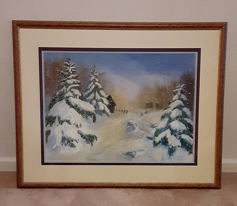 "Winter Woods" Framed original transparent watercolor painting featuring a snowy woodland scene. Framed at 31 3/4"h X 39 3/4" w Image size 22"h x 30". Frame is a round goldish, mat is off white inner mat is purple. Giclee' prints are available.